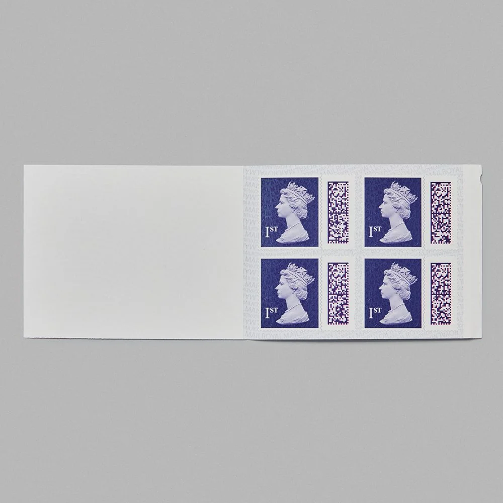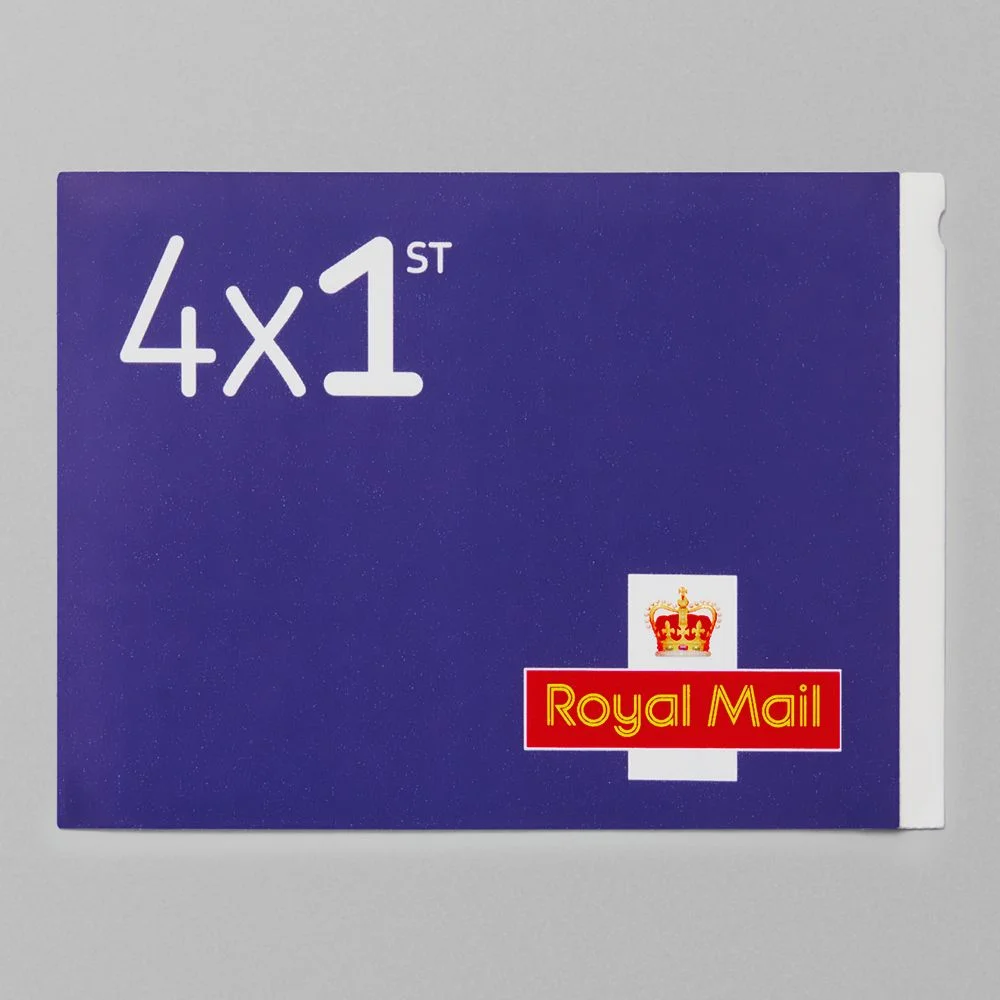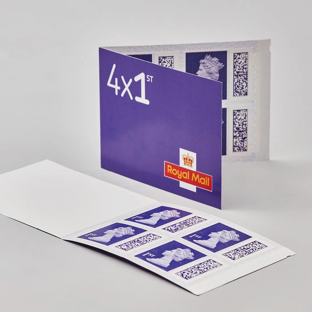 A book of four First Class stamps printed in the new Plum Purple colour scheme.